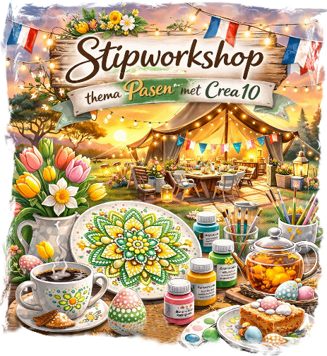 Bij Crea10 ga je ontspannen aan de slag met porselein stippen en maak je jouw eigen feestelijke Paascreatie.Met stippen, patronen en vrolijke Paasaccenten β denk aan eitjes, haasjes en bloemen β tover je een simpel item om tot een echte blikvanger. Je hoeft geen ervaring te hebben; ik begeleid je stap voor stap. Het draait om plezier, ontspanning en trots zijn op wat je zelf maakt.Even tijd voor jezelf, lekker creatief bezig zijn Γ©n naar huis gaan met iets moois dat elk jaar weer op tafel mag schitteren tijdens Pasen. Schuif gezellig aan en ontdek hoe leuk stippen is!